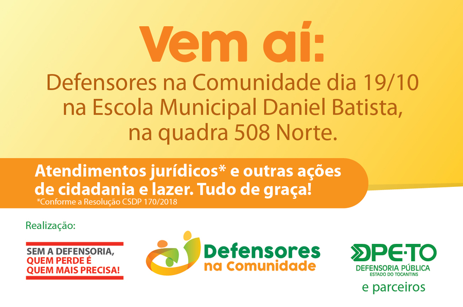 A região Norte de Palmas será o próximo setor beneficiado pelo programa “Defensores da Comunidade”, da Defensoria Pública do Estado do Tocantins (DPE-TO). A próxima edição está agendada para o dia 19 de outubro, na Escola Municipal Daniel Batista, na Arne 64. Essa edição contemplará moradores de toda a região norte da cidade.