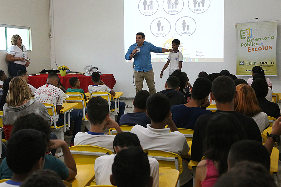 A adolescência é a faixa etária de maior vulnerabilidade para a experimentação e o uso abusivo de álcool e drogas, e os motivos que levam ao aumento do uso dessas substâncias são diversos. Os fatores que podem estar relacionados a essa fase da vida e as principais formas de prevenção foram assuntos de debate em mais uma edição do projeto “Defensoria nas Escolas”, realizado pela Escola Superior da Defensoria Pública (Esdep) nesta quarta-feira, 11. Na ocasião, cerca de 120 alunos da Escola Municipal Jorge Amado foram beneficiados com palestra ofertada pelo psicólogo Ronan Dorneles de Souza, gerente de Prevenção Contra as Drogas, da Secretaria Estadual de Cidadania e Justiça (Seciju).