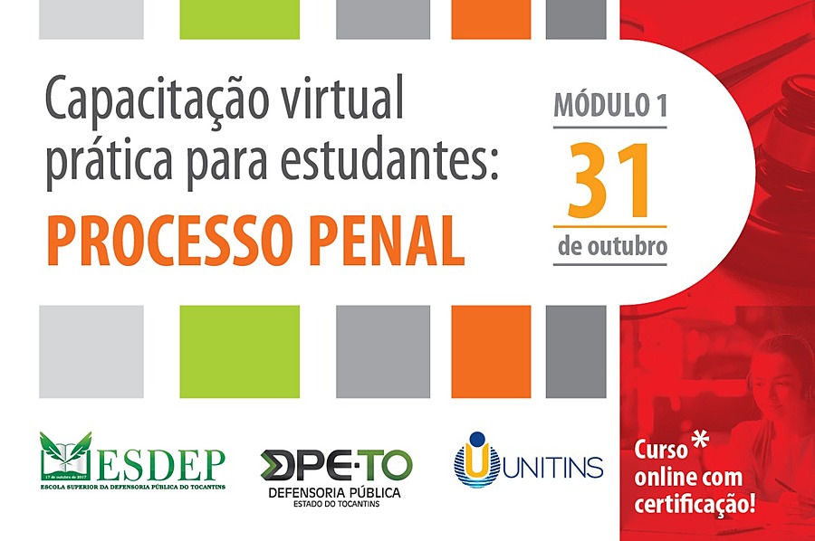 A Escola Superior (Esdep) da Defensoria Pública do Estado do Tocantins (DPE-TO), em parceria com o Núcleo Aplicado de Minorias e Ações Coletivas (Nuamac) de Dianópolis, abriu o período de inscrições para a “Capacitação prática para estagiários da DPE-TO e acadêmicos de Direito da Unitins: processo penal”. A atividade é gratuita e totalizará 6 horas distribuídas em aulas a serem realizadas nos próximos dias 31 de outubro e 7 de novembro.